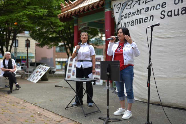 ⻄雅圖集會紀念天安門6.4大屠殺32週年的活動由瑪爾麗薩(Marleeza) 和金秀紅女士主持。